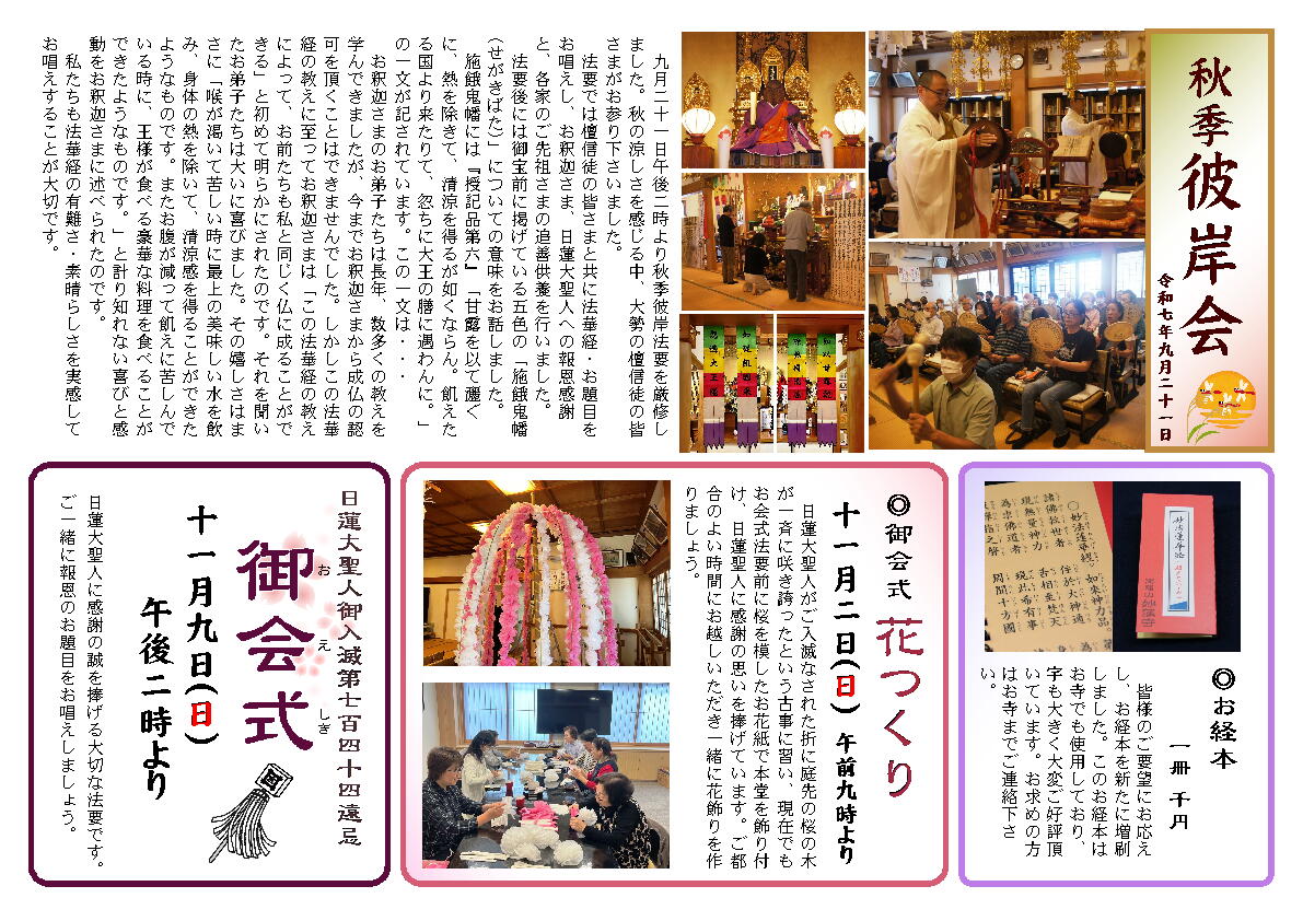 法華経の正しい理解とお題目の実践を教えてくださった日蓮聖人に報恩感謝の法要を行います。